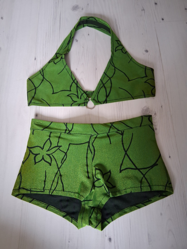 OverzichtGroene bikini met glitter en zwart patroon. Het topje is een haltermodel met en bikinisluiting achter. Bijpassende hotpants. Maat S/M. De stof heeft wat verkleuring door licht aan de zijkanten.