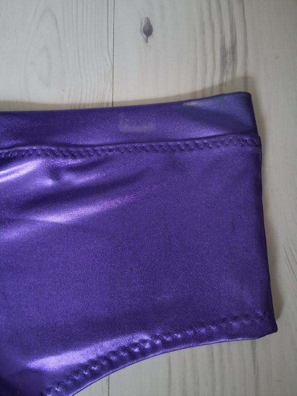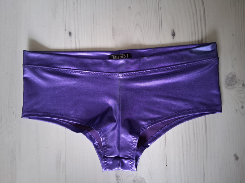 OverzichtSexy hotpants maat S, een hoogopgesneden broekje bij de billen, van metallic spandex. Verkrijgbaar in meerdere kleuren en alle maten. Met wat verkleuringen in de stof door licht.