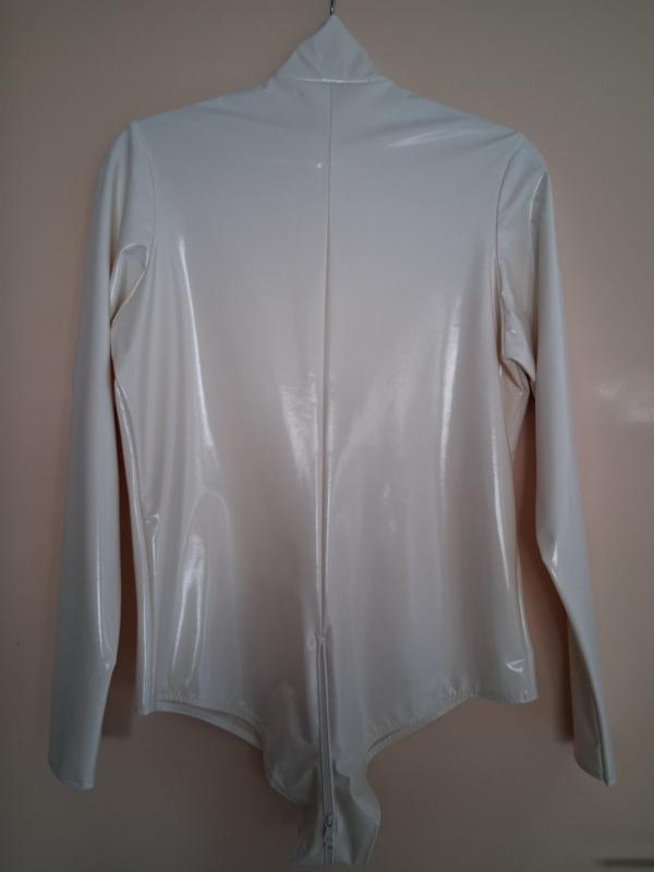 OverzichtLak body lange mouw maat 46/48, een mooie strakke bodysuit in off white van stretch-lak met lange mouwen en sexy hoog opgesneden bij de billen. Hoge opstaande kraag. Voorzien van een 3-weg rits die loopt van voor naar achteren. Romp afmeting voor tot kruis 72 cm, achter tot kruis 83 cm (romp totaal 155 cm).