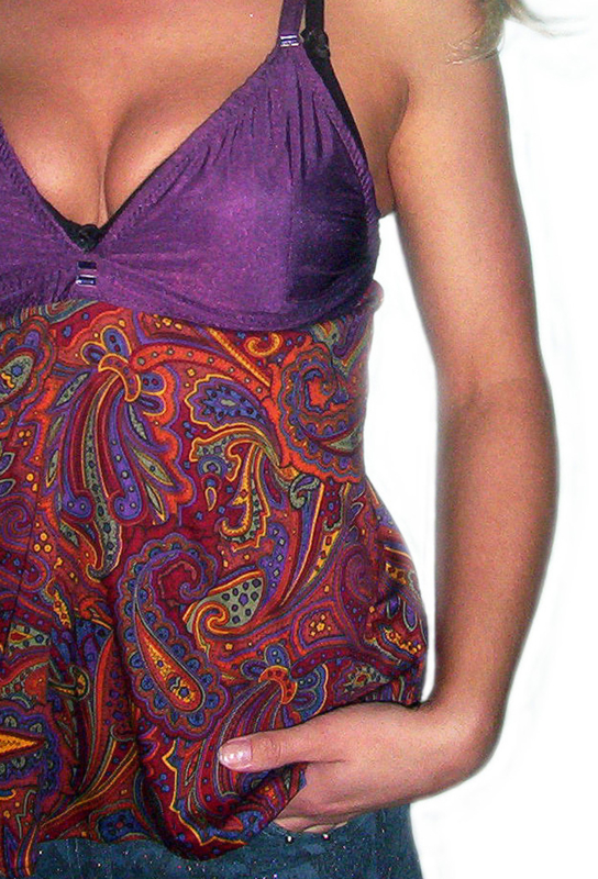 OverzichtBabydoll topje maat S, in een leuk model met bikinitop deel in paars glanzende t-shirt stof en in babydoll effect een paisley stof aangezet. Het top deel heeft schouderbandjes.