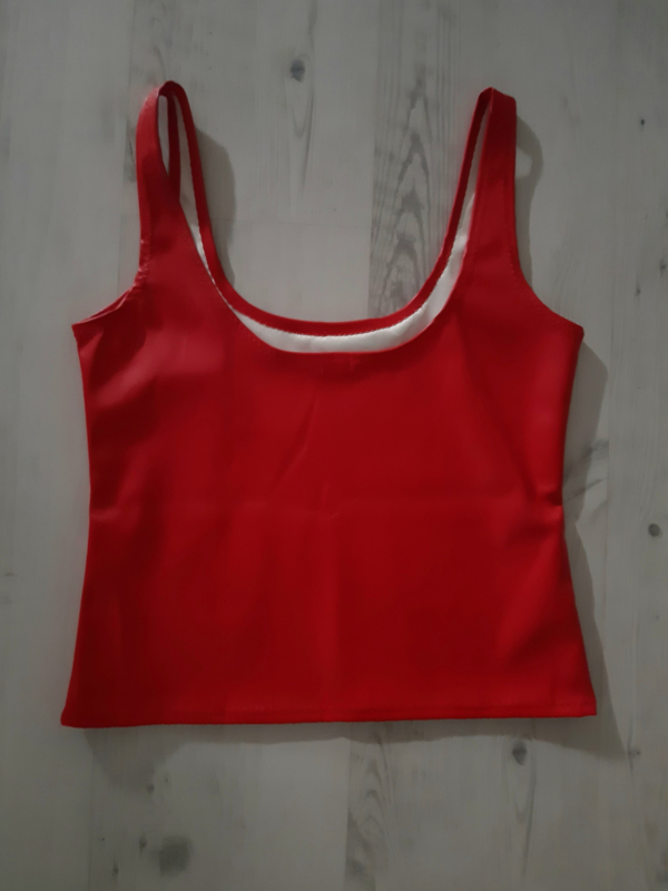 OverzichtImitatie leren top van soepele stretch-leer voorzien van een ronde halslijn voor en met een wat lagere ronde rug. Sexy aansluitend model. Maat S in rood