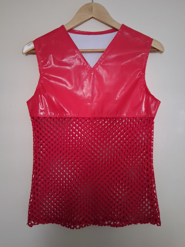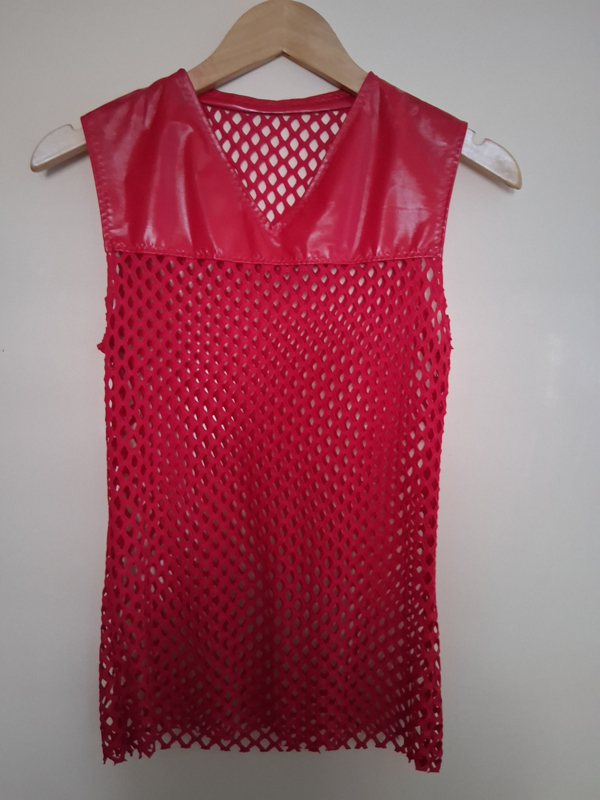 Rood net shirt met lak maat S enMRood net shirt met lak van een mooie rode net lycra. Voorzien van een v-hals, de bovenzijde voor en achter zijn van lak gemaakt, deze lak is iets stugger maar wel rekbaar. Passend voor maat S en M